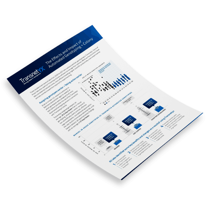 Discover how labs are accelerating research and improving efficiency by combining Transnetyx’s Automated Genotyping with Colony software. This case study highlights real-world results from multiple institutions, showing how faster genotyping turnaround times—up to 3 to 4 weeks sooner—allow for earlier decisions, streamlined breeding, and experimental timelines shortened by as much as two months. By reducing manual workload and improving data accuracy, labs increased productivity and output, with some even doubling their experimental capacity without adding resources.